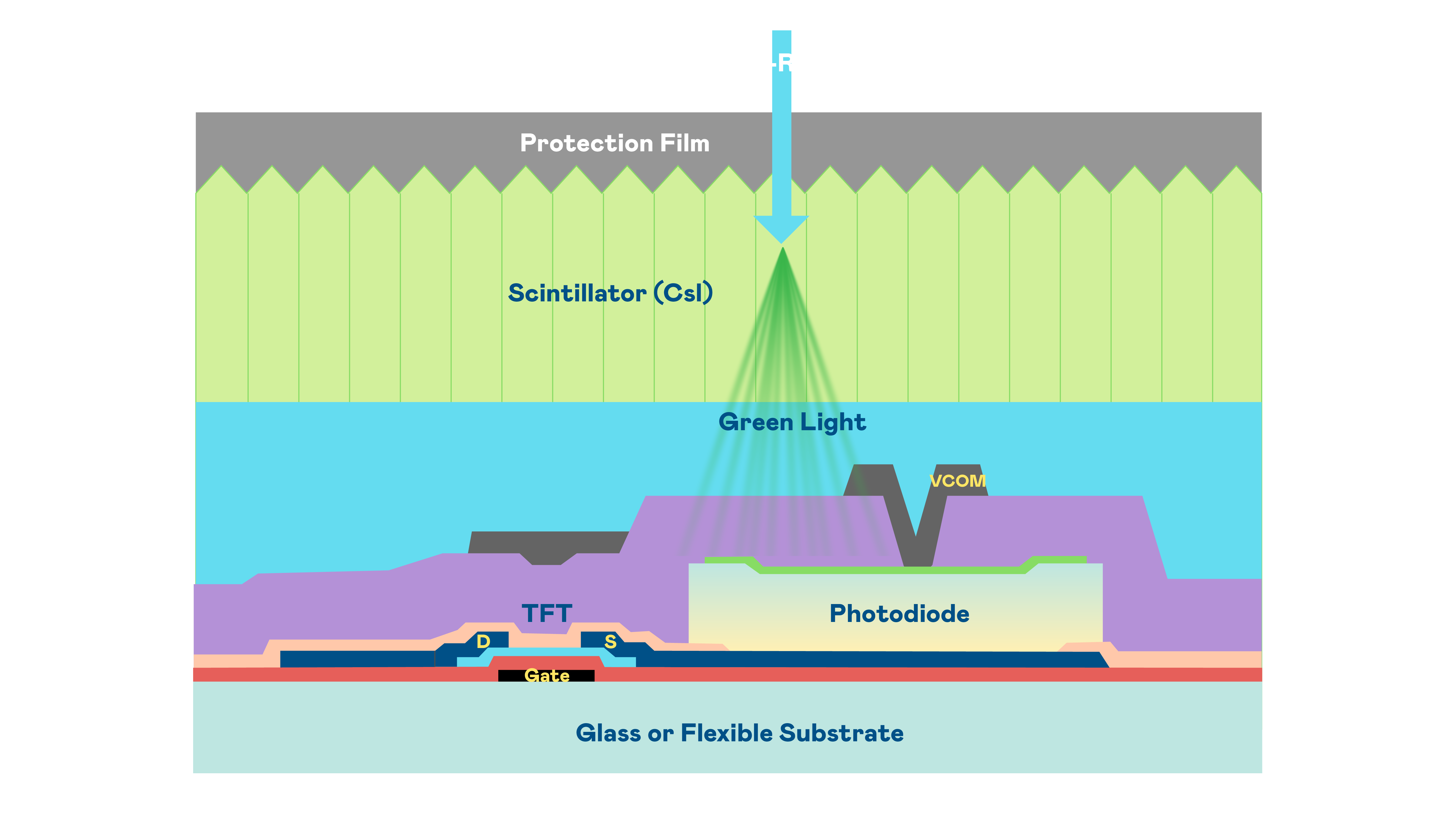 德晋贵宾厅的X光影像感測陣列使用薄膜電晶體 (TFT) 作為每個像素的讀取開關,搭配光電二極體(Photodiode)的光電轉換元件,用以感測X光影像訊號。